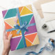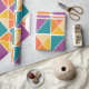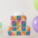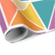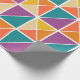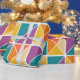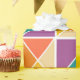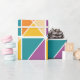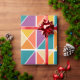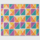 This wrapping paper has a Bauhaus design of squares made of triangles in shades of orange, yellow, purple, and blue.