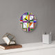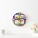 This wall clock has a Bauhaus design of lines, triangles, diamonds, and squares making a stained glass look in primary and secondary colours.