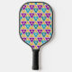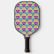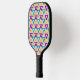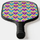 This pickleball paddle has a Bauhaus design of repeating triangles in gold, turquoise, teal, purple, and light gold. If you like the design but prefer different colours, message me.