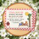 BBQ cookout picnic family annual reunion invitation with red gingham or vichy border featuring a whimsical table with chequered tablecloth and burgers, potato salad, watermelon and orange juice on it, a red gas barbeque grill, a tree and the sun. Great for a summer picnic. Art elements by Alice Smith.