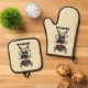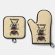 Dark ivory oven mitt and pot holder feature a BBQ grill with steer's horns and legs.
