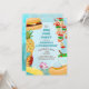 BBQ Pool Party birthday party invitation with tasty barbecue food on a swimming pool water background. The design has a burger, hotdog, chicken drumstick, kebab, corn on the cob, salad bowl, pineapple and a drink. BBQ Pool Party (editable) is lettered in retro typography and the invitation template is ready for you to personalise with your details. A fun summer design - ideal for backyard bbq party, annual family barbecue or birthday party for kids or adults alike.