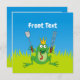 Prince frog with BBQ tools, tongs and spatula over green grass under blue sky.
