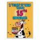 "I 'herd' it was your 15th birthday!" fun b-day cow holding a birthday cake greeting card.