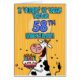 "I 'herd' it was your 58th birthday!" fun b-day cow holding a birthday cake greeting card.