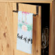 A kitchen towel with a cute saying: Be a flamingo in a flock of pigeons. Designed with an illustration of a momma and baby pink flamingo standing on a bed of floral succulent flowers with green palm trees swaying in the back. Tropical and pretty. The background is a summery light blue watercolor with hints of purple.