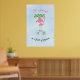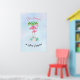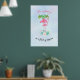 A poster with the funny quote: Be a flamingo in a flock of pigeons. Designed with an illustration of a momma and baby pink flamingo standing on a bed of floral succulent flowers with green palm trees swaying in the back. Tropical and pretty. The background is a summery light blue watercolor with hints of purple.