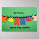 Adorable clothesline with colourful children's clothes hanging on it, and message of friendship: "Be A Friend. Friends Hang Together."