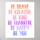 "Be brave, be creative, be kind, be thankful, be happy, be you." Inspirational, colourful watercolor quote.
