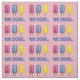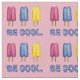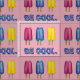 Fabric is printed on a pink background, with an original illustration of pink, yellow, and blue "twin pop" popsicles, with BE COOL written underneath in a fun blue font. The perfect summertime fabric!