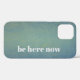 Blue green phone case with the mindfulness reminder “be here now”. Copyright Kate McKenna. All rights reserved.