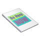 "Be Here Now" in Blue, Pink. Yellow and Teal on a lined journal or notebook.