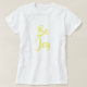 White t-shirt with "Be Joy" in yellow text.