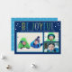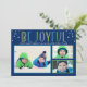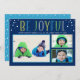 Share a bright “Be Joyful” greeting with this modern photo holiday card. Colorful tall lettering pops on a deep navy background above a three-photo collage layout. Personalize the family line and year for your seasonal send. Back features a coordinating light blue snow dot pattern, shown.