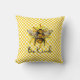 Sunny and bright throw pillow design features a yellow and white chequerboard pattern with fuzzy yellow and black bee & sunflowers overlay and "Be Kind" text.