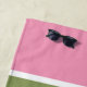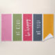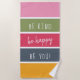 Colour palette striped beach towel with positive quote. The wording reads "Be kind be happy be you!" and is lettered in handwritten script and whimsical typography. The design has 5 coloured stripes in pink, green,, cerise, blue and yellow. A happy and cheerful design for the garden, pool or beach. Please browse my store for coordinating bags and outdoor pillows.