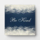 Be kind. Written on a fancy elegant design with cream coloured lace and pearls made with circles and bubbles. The background is dark blue with faded squares off to the side. Pretty, classy and delicate.
