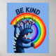 Kindness poster with a funny character holding a rainbow and the text "Be Kind". Because we sometimes have to be reminded that just being a nice human makes the world little better.