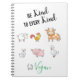 This Vegan notebook features six fun cartoon farm animals (sheep, rooster, cow, rabbit, pig, and goose) on a white background, with the texts "Be kind to every kind" in black on the top and "Go Vegan" in black and green on the bottom.