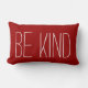 The perfect reminder for all! Be Kind, in white text on crimson red pillow. Back of pillow has small text which says: In a world where you can be anything....
