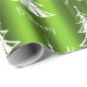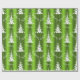 This festive, green and white Christmas wrapping paper features a modern pattern of white Christmas trees, with the words 'Be Merry' scattered over a bright, colourful green background.