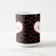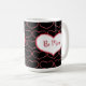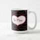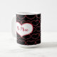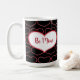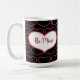 This mug features a graphic design that's made up of a red and white hearts, in a repeating pattern. On the left and right sides of the mug there is a large white heart with red trim. The text inside, "Be Mine" can personalised can be personalised with your own message or a name.