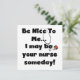Nurse text T-shirts, mugs, cards, stickers, buttons, bags, and other nursing apparel and gifts with a stethoscope and text that reads "Be nice to me...I might be your nurse someday!".