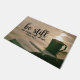 Inspirational scripture doormat depicts a peaceful scene of an open Bible sitting next to a cup of steaming hot beverage, maybe coffee or tea, on a railing overlooking the water. It features Bible Verse Psalm 46:10, "Be still and know that I am God."-