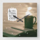 Inspirational scripture wall clock depicts a peaceful scene of an open Bible sitting next to a cup of steaming hot beverage, maybe coffee or tea, on a railing overlooking the water. It features Bible Verse Psalm 46:10, "Be still and know that I am God."