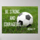 Be Strong and Courageous, Bible Verse from Joshua 1:9, with a soccer ball in the grass. Perfect inspirational Christian quote saying for the boy or girl who loves soccer and sports. Religious motivational gift for kids, children or sports team enthusiast.