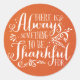 Rustic Thanksgiving sticker featuring whimsical script on an orange linen background. This item is available in other background textures and colours.