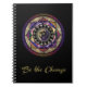 Be the Change with Purple and Gold Mandala Journal Notebook. This notebook or personal journal has a black background and a colourful, metallic purple and gold Mandala with a yin-yang and OM Symbol at the centre, and bronze mystical symbols. A Mandala is a spiritual and mystical symbol in Hinduism, Buddhism and Celtic cultures, representing the Universe. In spiritual traditions, mandalas are used for focusing attention, as a spiritual teaching tool, for establishing a sacred space, and to assist in meditation and inducing a trance.