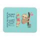 A flexible magnet with an amusing saying: Be You the world will adjust. Designed with an illustration of a cute brown sloth hanging upside down. This funny little guy is holding onto a branch which has a little pink bird on one side of the branch and a doodle-style rose bouquet on the other side. Below them is an arrangement of colourful hand-drawn flowers. This adorable sloth also has pink rosy cheeks and 3 cute little hearts on his butt.