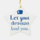 This two sided ornament is star shaped and has a fitting message. On one side is the night sky with the words: Be Your Own Star and Shine Bright! The words are printed in white with a yellow/orange star beneath. On the flip side, the background is white with the blue words, "Let your dreams lead you." Above those words is a graphic of a night sky with a moon and stars.