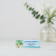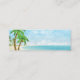 This business card features a tropical beach with palm trees. The water is a beautiful blue and there are clouds scattered in the sky. -