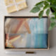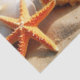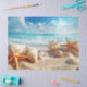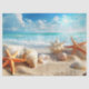 Tissue/craft paper with seashells, starfish on a beautiful sandy beach with the ocean waves in the background.