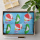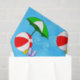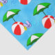 Tissue paper with fun beach or swimming pool themed art of a red beach ball, green sun umbrella, vacation sandals and suntan oil on a wavy blue background.