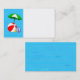A custom business card template with fun beach or swimming pool themed art of a red beach ball, green sun umbrella, vacation sandals and suntan oil on a watery blue background with curly waves. Click Customise It to choose your fonts, add custom text, even save your design for later.