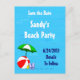 A custom Save the Date postcard with fun beach or swimming pool themed art of a red beach ball, green sun umbrella, vacation sandals and suntan oil on a watery blue background with curly waves. Click Customise It to change fonts, sizing and more, even save your design for later.