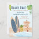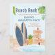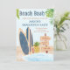 Beach Bash Birthday Party Invitation for a graduation party - perfect for pool party, beach party, bbq, surfing, tropical or any fun in the sun theme. Watercolor surfing beach scene features surfboards, wooden direction sign (with the party time and date), tiki glass, pineapple and hibiscus flower set on a sand beach with water pool. Beach Bash is hand lettered, painted in watercolor and decorated with tropical palm leaves.