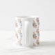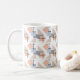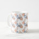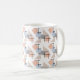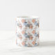 This mug has a Bauhaus design of repeating rectangles, squares, diamonds, and triangles in beach colours of tan, grey, blue, and orange.