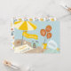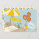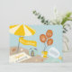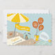 A fun, bold, and illustrated beach birthday party invitation that cleverly integrates text on balloons, beach towels, flags, and bubbles to set it apart from traditional invitations.