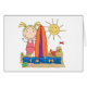 A blonde haired stick figure girl with a surfboard builds a sand castle under a smiling summer sun on BEACH T-shirts, hoodies, bodysuits, cards, stickers, beach bags, magnets, and more.