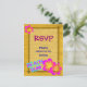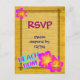 A custom RSVP postcard with custom text and hibiscus flowers reading Beach Bum funny saying in distressed driftwood letters in bright teal and ocean blue colours with a sandy yellow outline. Click Customise It to change fonts, add or remove elements and more, even save your design for later.