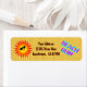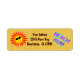 Custom return address labels in a retro font, reading Beach Bum in distressed driftwood letters in bright teal and ocean blue colours on one side and a smiling sun with sunglasses on the other side, on a faux tiki mat background.. Perfect for lounging around the beach, pool or backyard.