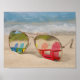 Row of colourful Adirondack beach chairs in aviator sunglasses reflection in sand
