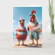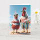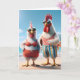 A whimsical scene shows two anthropomorphic chickens dressed in beachwear and sunglasses on the beach