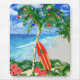 Happy Holidays from the warm sandy beaches of your favourite tropical island beach. Palm tree decorated with Christmas ornaments and lights, with a retro surfboard leaning against the Christmas tree.