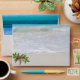 Beach scene envelope with smooth beach sand and little waves at the shore. Starfish and holly design with a single sea star on the front and pattern inside under the flap. Use to mail holiday greetings from a warm climate.