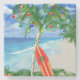 Happy Holidays from the warm sandy beaches of your favourite tropical island beach. Palm tree decorated with Christmas ornaments and lights, with a retro surfboard leaning against the Christmas tree.